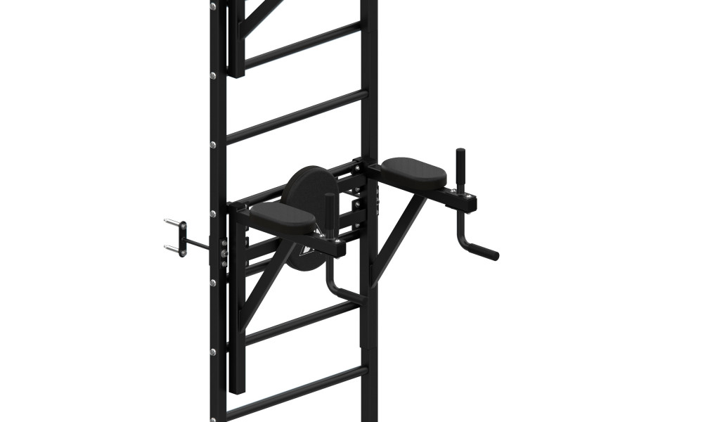 Турник длиной 110 см и брусья оснащены мягкими неопреновыми ручками, очень легко перевешиваются на перекладины шведской стенки, что позволяет менять их высоту. Расстояние от ручек турника до шведской стенки (вынос турника) - 51 см. Размер подушки составляет 35 х 27 см, а подлокотников 25,5 х 12,5 см. Толщина подлокотников и подушки - 4 см. J-образные ручки размерами 15,5 и 17,5 см, расстояние между ними - 56,5 см.